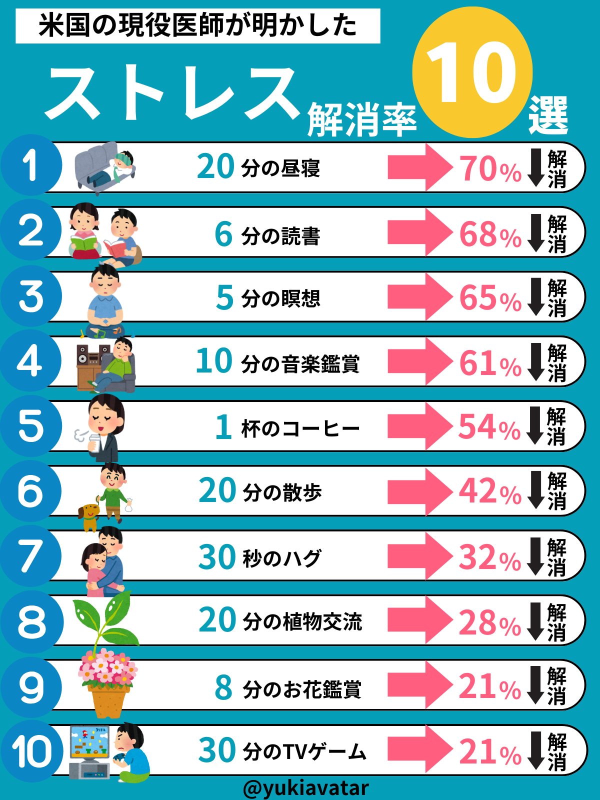 これをするとあなたのストレスは○○%解消されますよ、という内容。